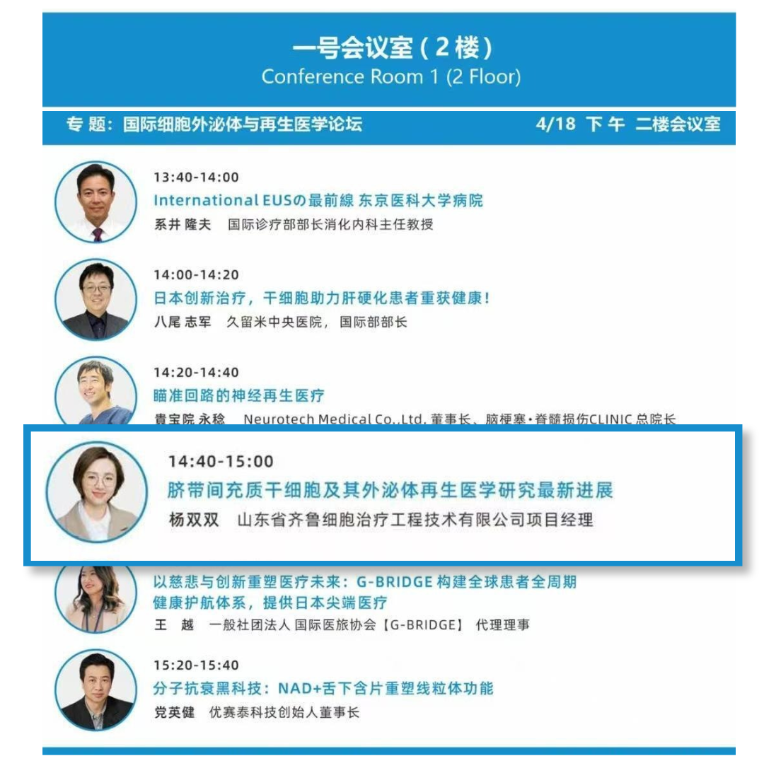 此次大会,我公司研发团队核心成员杨双双博士于4月18日下午,在展馆二楼会议厅举办的国际细胞外泌体与再生医学论坛中,将进行题为《脐带间充质干细胞及其外泌体再生医学研究最新进展》的发言分享,届时期待与您的现场交流。