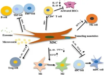 间充质干细胞具备通过分泌可溶性因子,比如PGE2、IL-10、TGF-β等,与先天性和适应性免疫系统的免疫细胞进行相互作用的能力,抑制TH1,TH17淋巴细胞分群,促进Treg细胞分化,促进M1向M2极化等这些因子有助于维持体内免疫系统的平衡状态。