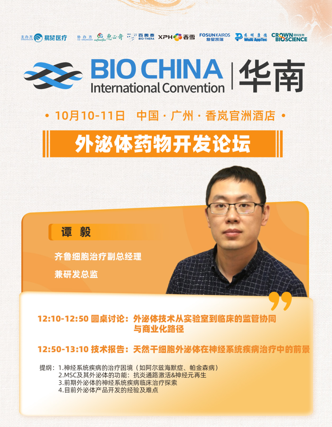在众多精彩议题中,“外泌体开发论坛” 因其在再生医学与药物递送领域的潜力而备受期待。齐鲁细胞副总经理兼研发总监谭毅博士受邀出席此次会议并担纲核心角色,从宏观讨论到技术纵深,全方位分享其独到见解,为与会者带来一场关于外泌体技术临床转化的思想盛宴。