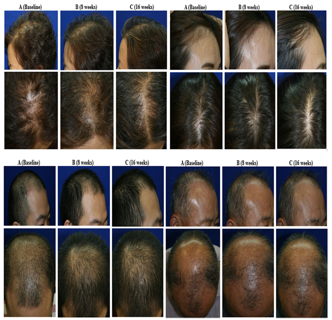 结果发现:基线时平均头发密度为96.5根/cm²,头发直径0.049 mm,脱发数量200根。干预后,平均头发密度在6周时增加了69.4%;头发直径在3周和6周时分别增加至0.058 mm和0.059 mm;平均脱发数量在6周时显著减少至80根,未观察到显著不良反应或临床实验室指标变化。