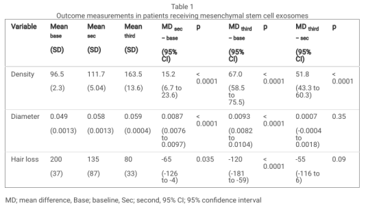 在30名22-65岁的III–VI级男性脱发患者头皮的3个区域注射300×109个干细胞外泌体。结果发现:平均头发密度明显增加,治疗前的149.7根 /cm² 在治疗后第4周增加到153.6根 /cm²,并在第12周进一步增加到157根 /cm²,且患者对治疗效果的满意度在12周时较4周时明显提高。