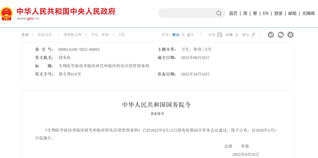 2025年10月10日,国务院总理李强签署国务院令,正式公布《生物医学新技术临床研究和临床转化应用管理条例》(国务院令第818号,以下简称《条例》),并将于2026年5月1日起施行。该《条例》的出台对推动我国生物医学新技术临床研究和临床转化应用的创新发展具有重要意义,为生物医学新技术临床研究的规范管理提供了坚实依据。
