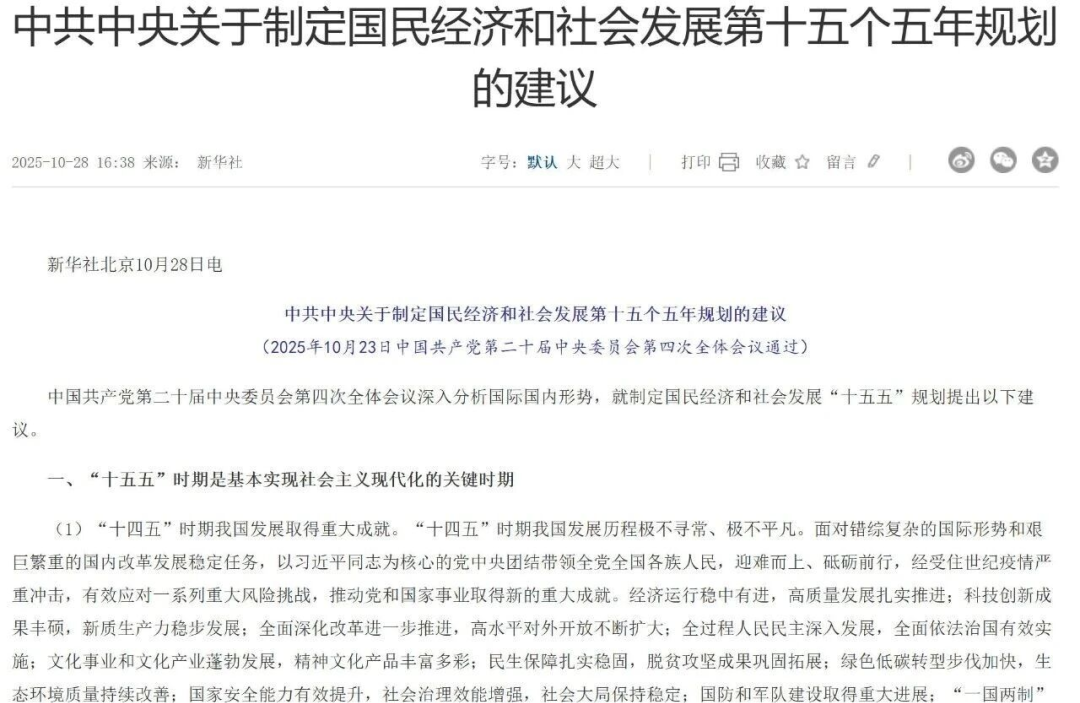 新华社北京10月28日电,中共中央关于制定国民经济和社会发展第十五个五年规划的建议正式发布。《建议》提出打造新兴支柱产业,加快新能源、新材料、航空航天、低空经济等战略性新兴产业集群发展,将生数个万亿元级甚至更大规模的市场;《建议》还提出前瞻布局未来产业,推动量子科技、生物制造、氢能和核聚变能、脑机接口、具身智能、第六代移动通信等成为新的经济增长点,这些产业蓄势发力,未来10年将再造一个中国高技术产业。