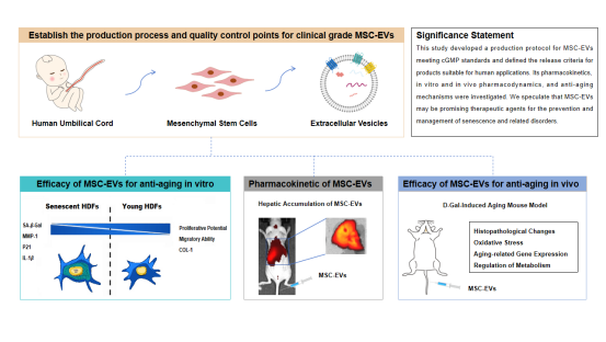 该研究围绕脐带间充质干细胞来源外泌体(MSC-EVs)在调控细胞衰老中的作用展开,系统建立了符合cGMP标准的临床级外泌体制备流程,并明确了适用于人体应用的产品质量标准。团队通过体外细胞实验与D-半乳糖诱导的衰老小鼠模型,验证了MSC-EVs在减轻衰老相关标志物表达、改善组织病理变化、缓解氧化应激及调节代谢通路等方面的显著效果。