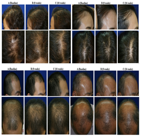 结果发现:基线时平均头发密度为96.5根/cm²,头发直径0.049 mm,脱发数量200根。干预后,平均头发密度在6周时增加了69.4%;头发直径在3周和6周时分别增加至0.058 mm和0.059 mm;平均脱发数量在6周时显著减少至80根,未观察到显著不良反应或临床实验室指标变化。