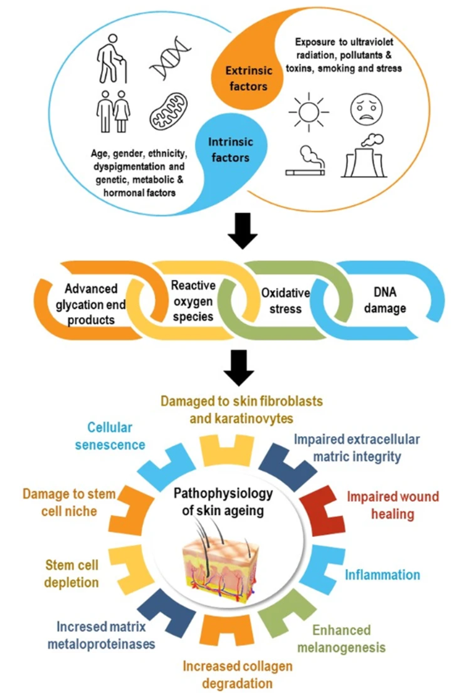 皮肤老化是一个由内源性生理衰退与外源性环境损伤共同驱动的复杂生物学过程。简单来说,内在衰老是“程序设定”的缓慢过程,而外在衰老则是“环境攻击”导致的加速老化,两者共同导致了我们肉眼可见的皮肤衰老征象。