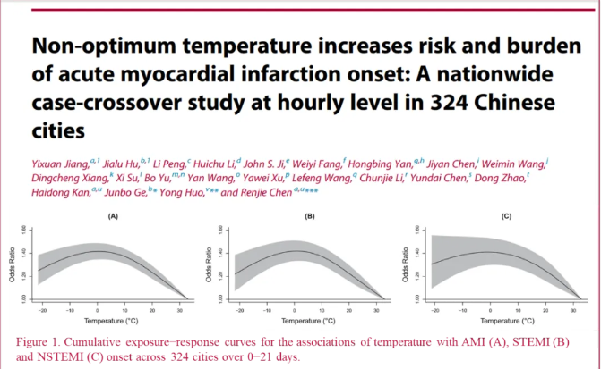 国内一研究团队基于国内心血管健康-胸痛中心数据库,开展了一项温度与急性心梗发作的流行病学研究,并于2023年6月将研究结果在线发表于《柳叶刀》子刊 EClinicalMedicine上。