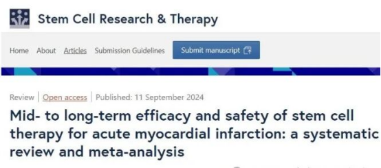 由韩国首尔国立大学医院牵头组建的科研团队,在国际权威期刊《干细胞研究与治疗》上发表了一篇题为《干细胞治疗急性心肌梗死的中远期疗效与安全性:系统性评价与荟萃分析》的文献综述。