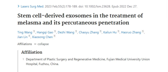 国际专业期刊Lasers Surg Med. (激光外科医学)上也曾发表过一篇题为Stem cell-derived exosomes in the treatment of melasma and its percutaneous penetration(干细胞来源的外泌体治疗黄褐斑及其经皮渗透技术)的临床研究报告。