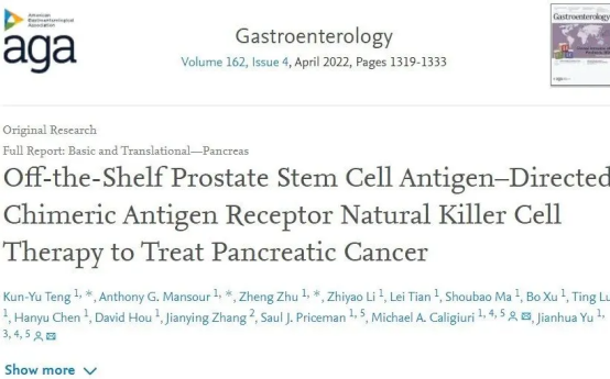 2022年1月6日,《Gastroenterology》发表的一项创新研究表明,CAR-NK技术对胰腺癌具有一定的潜力,有望成为未来治疗的重要方向。研究发现60%-80%的胰腺癌患者表达前列腺干细胞抗原(PSCA),而针对该靶点构建的CAR-NK细胞展现出了良好的可行性、安全性及治疗潜力。