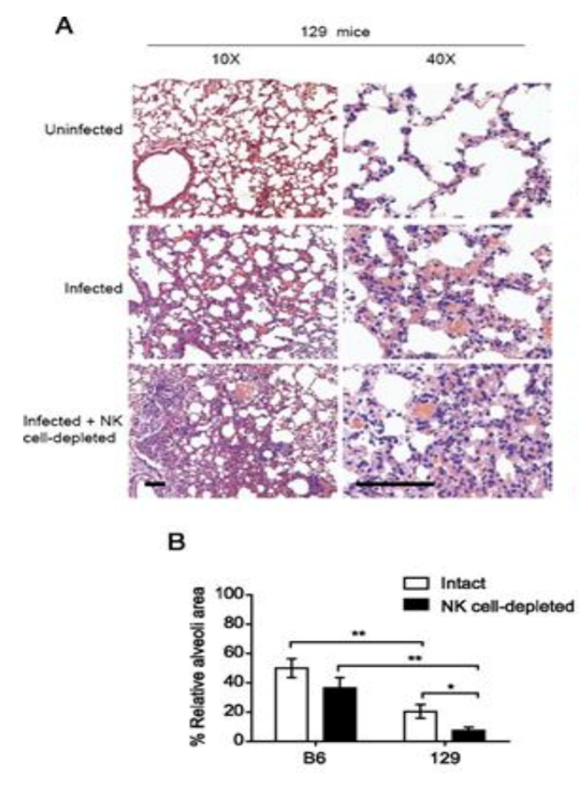 一篇发表在国际免疫医学期刊《the Journal of immunology》中题为《Swift and Strong NK Cell Responses Protect 129 Mice against High-Dose Influenza Virus Infection 》的研究中,研究人员发现,在两组小鼠同时面对大剂量流感病毒时,体内NK细胞数量低的小鼠的感染率更高,因为病毒感染而受到的肺部损伤也更严重。