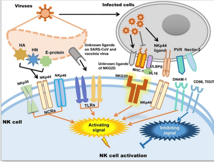研究表示,NK细胞可以被病毒产生的细胞因子激活。当机体感染后,流感病毒与上皮细胞和免疫细胞中的受体结合,将产生高水平的炎症细胞因子和趋化因子,这改变了肺部微环境,并启动了体内NK细胞或者其他免疫细胞(例如巨噬细胞、树突状细胞、和中性粒细胞)的招募,甚至伴随着免疫细胞的增势,数量大幅上升。在此之后免疫细胞便被运输到感染部位,分泌细胞溶解颗粒,在直接接触后清除这些被病毒感染的细胞。