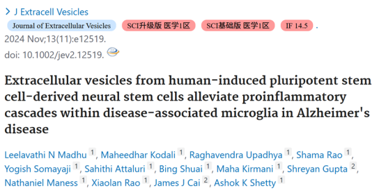 一项研究结果发现干细胞来源的细胞外囊泡能抑制阿尔茨海默病模型中小胶质细胞的促炎反应,减少脑内炎症和斑块沉积。研究者称该疗法或可延缓病程10-15年,可能能显著改善患者生活质量。相关研究结果发表在《Journal of Extracellular Vesicles》上。