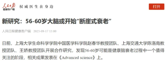 近日,《人民日报》刊载的一项研究指出,科学家们获得了一项突破性发现:人类大脑并非随年龄增长匀速衰老,而是在56至60岁之间经历一个明显的“断崖式衰老”转折点。