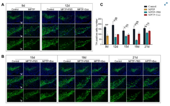 一项动物研究证实,鼻内给药后,脐带来源的间充质干细胞外泌体很容易穿过血脑屏障,主要在SNpc中积累。这些干细胞外泌体被嗅觉和多巴胺能神经元进行内吞,增加了嗅球神经元的活性,并逆转了SNpc中多巴胺能神经元的丢失。