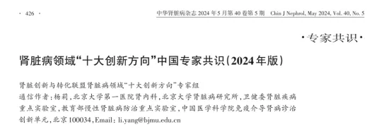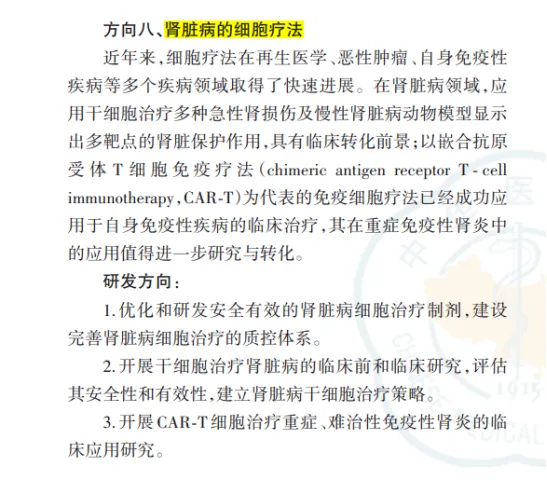 2024年,《中华肾脏病杂志》发布了《肾脏病领域"十大创新方向"中国专家共识(2024年版)》。其中,创新方向八的内容为肾脏病的细胞疗法。