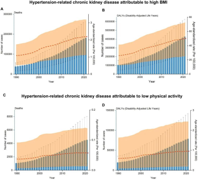 该研究的里程碑意义在于,首次在全球尺度上通过长期、多维度的数据分析,明确了这两种风险因素对高血压相关慢性肾病(HT-CKD)的具体影响,并揭示出其显著的“负担差异”。其中,肥胖是占据绝对主导地位的因素,然而,久坐的危害同样不容忽视。过去30年间,久坐相关HT-CKD的死亡数增长了342.15%,DALYs增长了312.47%。久坐常与肥胖产生协同效应——它会放大肥胖带来的代谢损伤;反之,规律运动即便未能减轻体重,也能在一定程度上缓解肥胖对肾脏血管的伤害。