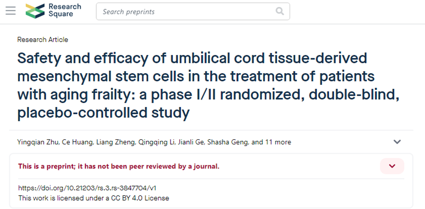 行业期刊《Research Square》发表了间充质干细胞在老化衰弱症领域的最新研究成果。研究团队提出:脐带间充质干细胞静脉移植是一种安全有效的应对衰老虚弱的方法。