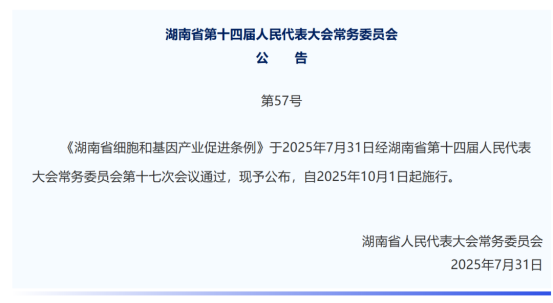2025年7月,《湖南省细胞和基因产业促进条例》(以下简称《条例》)正式制定出台,为湖南省细胞和基因产业发展提供了坚实的法治保障,推动产业迈入规范化发展轨道。