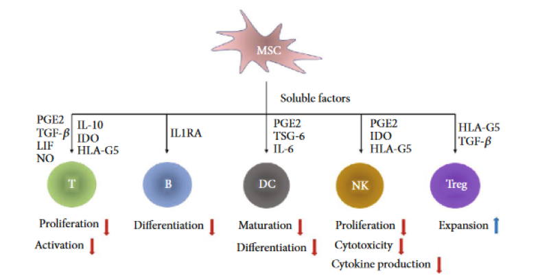 间充质干细胞具有多种特性:能够分化成各种成熟的细胞系,分泌对细胞生存和增殖至关重要的可溶性因子,归巢迁移到确切的损伤部位进行损伤修复,抗炎抗菌并调节免疫反应。