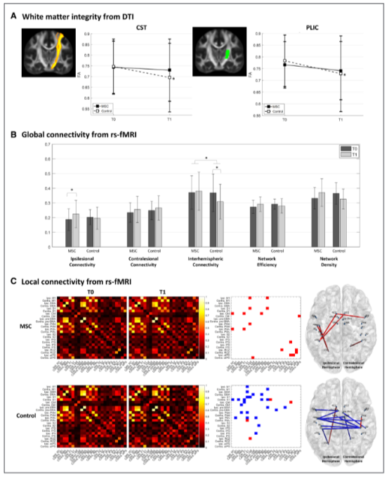 在神经影像学分析中,干细胞应用组从DTI获得的皮质脊髓束和内囊后肢FA值没有降低,这一现象表明,基于干细胞的治疗可能调节脑卒中引起的神经变性。rsfMRI测量表明干细胞应用组双侧大脑半球间的连接显著增加,连接强度无明显变化。