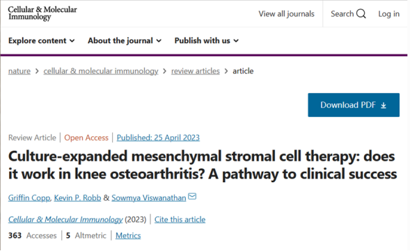日前,加拿大多伦多大学研究团队在nature子刊cellular & molecular immunology杂志上发表了相关综述,基于15项随机对照临床试验(RCTs)和11项使用培养扩增的间充质干细胞(MSC)来应对膝关节骨关节炎的非随机RCT的评估结果,发现间充质干细胞对减轻疼痛和症状和软骨保护和/或修复的积极影响,表明间充质干细胞在缓解其症状和疾病进展方面显示出作为多模式疗法的前景。