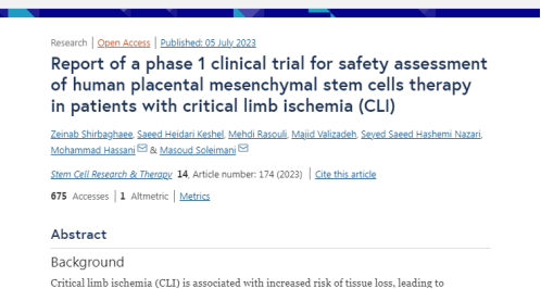 《Stem Cell Research & Therapy》中发表的一项剂量递增的一期临床研究,评估了9名患有重症下肢缺血对人胎盘间充质干细胞治疗的耐受性,并评估了这种方法的可行性和耐受性。