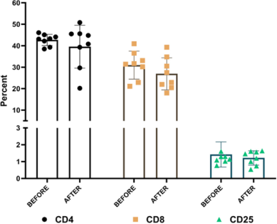 结果显示:在接受P-MSC应用后6个月的随访期间,IL-1和IFN-γ的血清水平显著降低。P-MSC临床试验前后,CLI患者的血液淋巴细胞亚群没有明显变化,表明p-MSC注射对CLI患者的免疫状态没有不良影响。